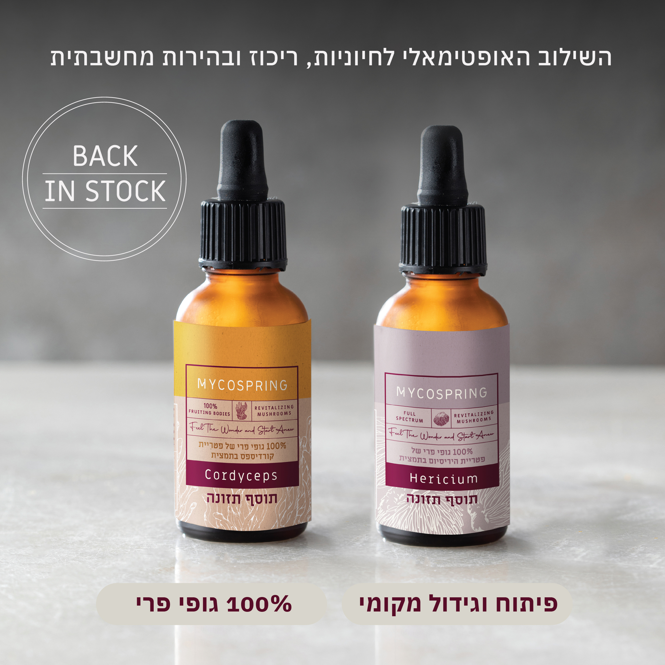 הקורדיספס מסייעת להעלות את רמות החיוניות, לשפר את הסיבולת ולתמוך בבריאות מערכת הנשימה, ואילו ההיריסיום תורמת לחיזוק הקשרים העצביים, משפרת את הריכוז, ומסייעת בשימור ושיפור תפקודי המוח. יחד, הם מציעים שילוב עוצמתי שמעניק גם חיוניות פיזית וגם תמיכה קוגניטיבית – לתחושת רעננות ומיקוד לאורך כל היום.