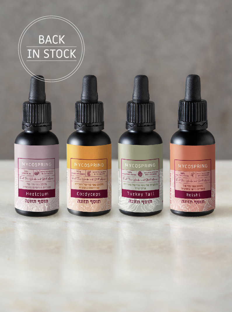 מארז של ארבע תמציות פטריות המרפא האיכותיות של מיקוספרינג – קורדיספס, ריישי, היריסיום וטרקי טייל.