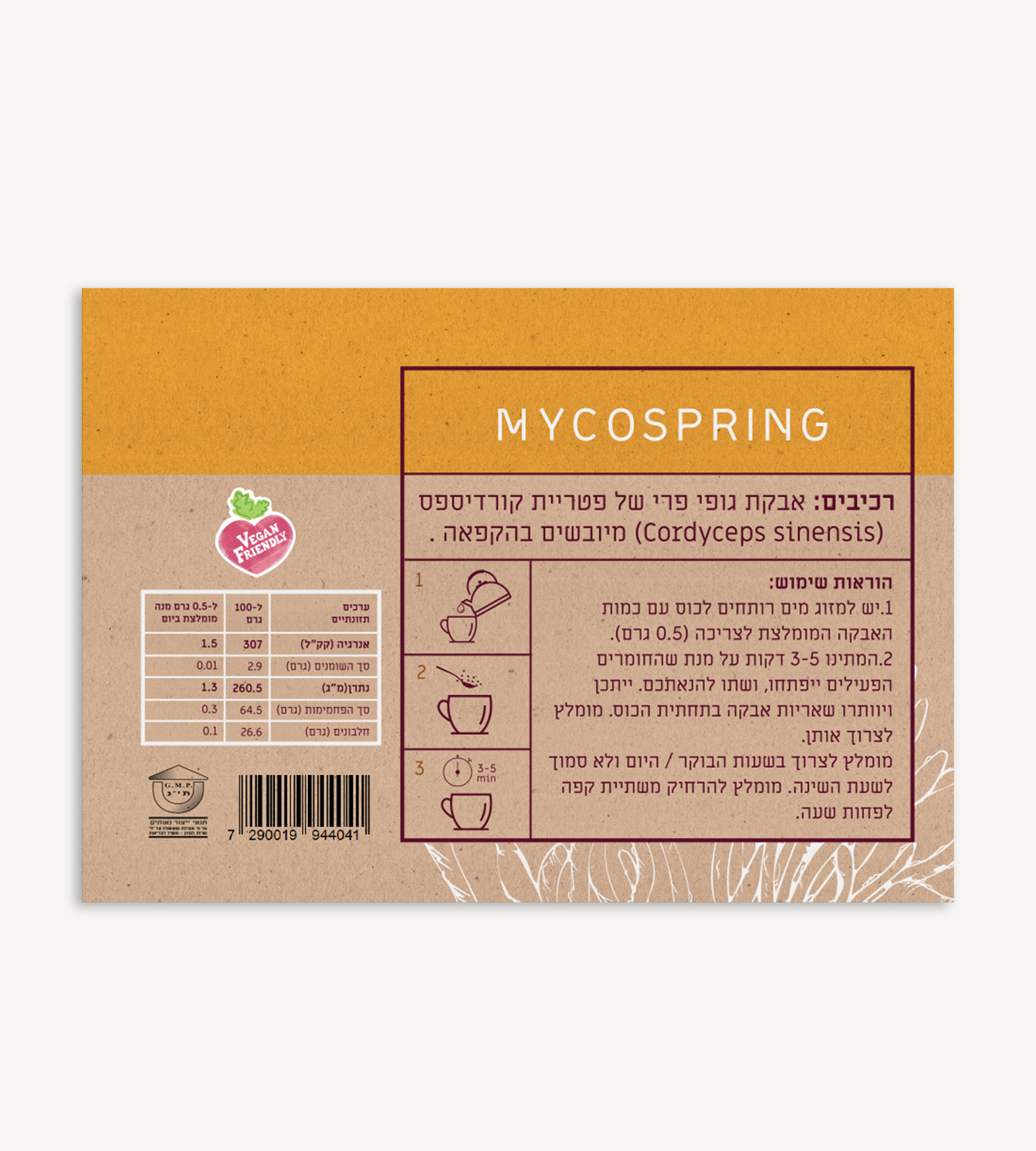 אבקת קורדיספס ואבקת היריסיום הינן תוסף תזונה טבעי. הוא לא נועד לאבחן, לרפא או לטפל ואינו מחליף התייעצות עם רופא.